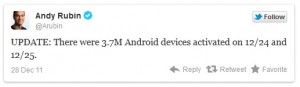 El vicepresidente de ingeniería de Google y supervisor del desarrollo de Android, Andy Rubin, anunció con un tweet la noticia. Hace solo una semana el ejecutivo anunciaba que 700.000 dispositivos Android eran activados diariamente.