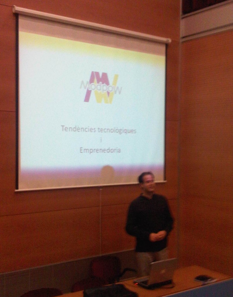 David Miralles profesor de la asignatura Tendencias tecnológicas invitó al equipo de Modpow para explicar a los alumnos su experiencia emprendedora. El equipo de Modpow motivó a los alumnos en aspectos técnicos y de negocios. Hicieron hincapié en que no deben temer tratar con nuevas tecnologías ya que la universidad les ha formado para que sean capaces de afrontar y aprender nuevas tecnologías, la universidad solo les ha facilitado herramientas para que sean capaces de trabajar con cualquier tecnología que se encuentren.